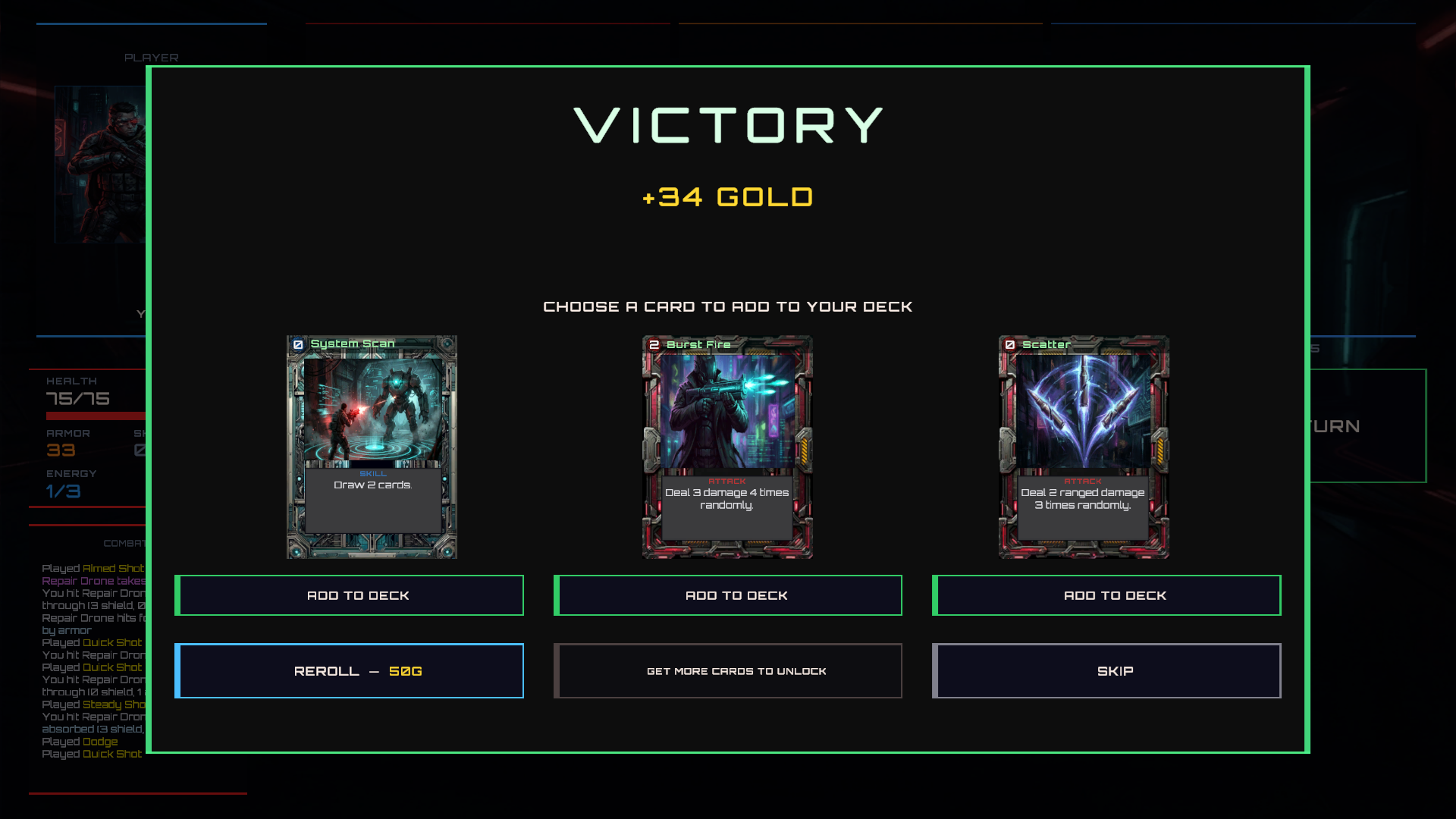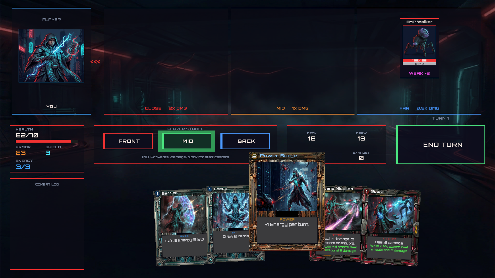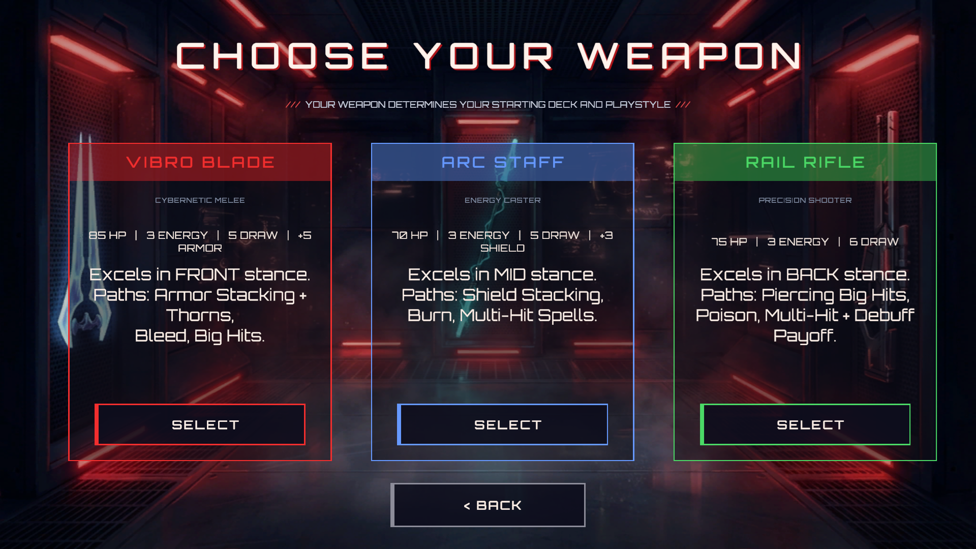A cyberpunk roguelike deckbuilder. Wield a plasma sword, channel energy through an arc staff, or snipe from afar with a rail rifle. Build your deck, manage your shields, and outplay an adaptive AI through three procedurally-generated acts.