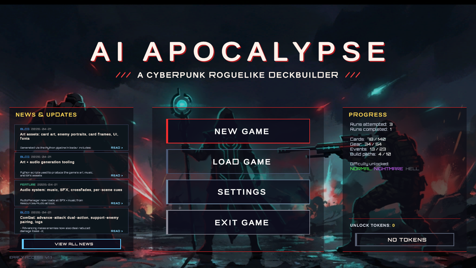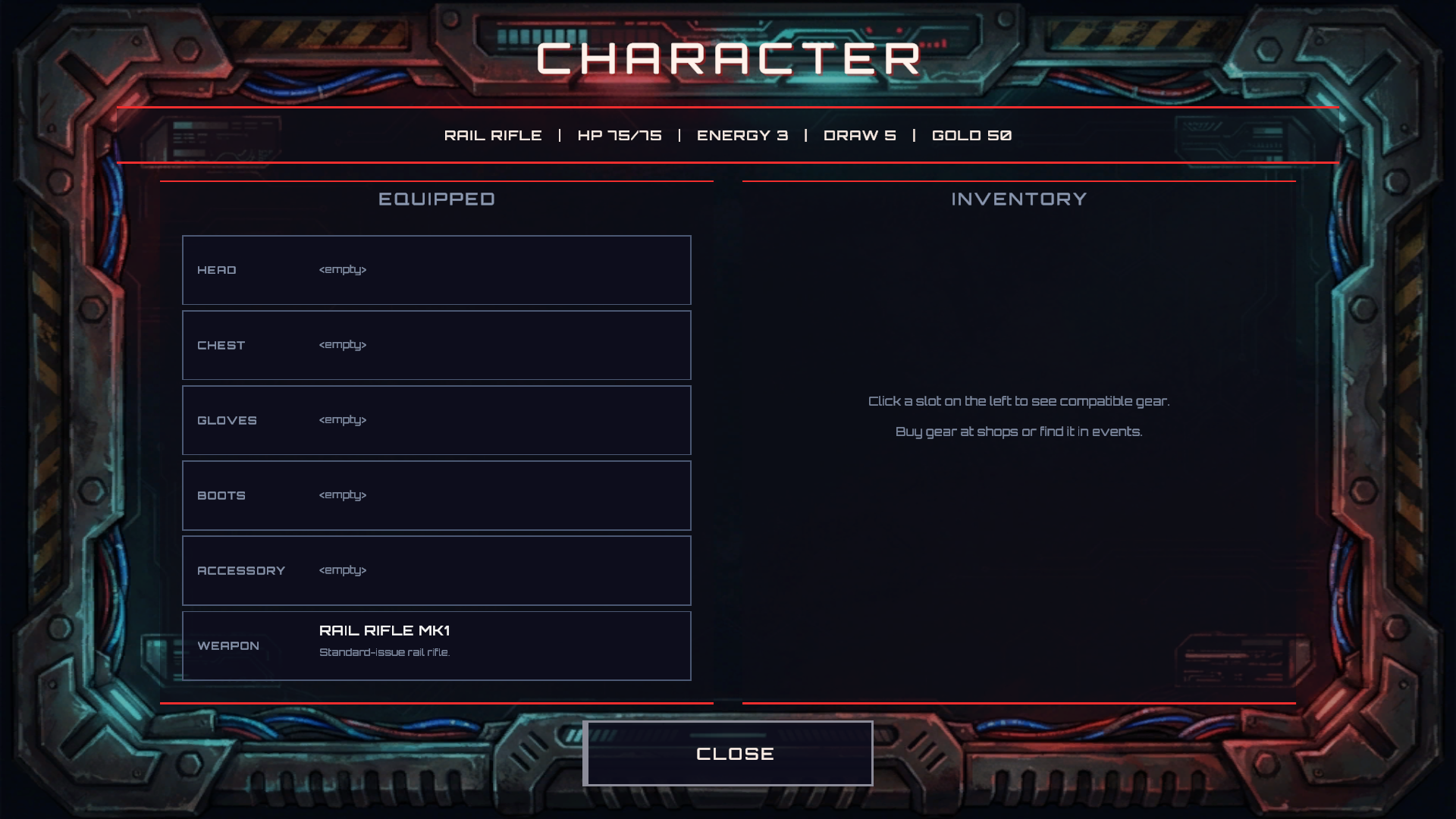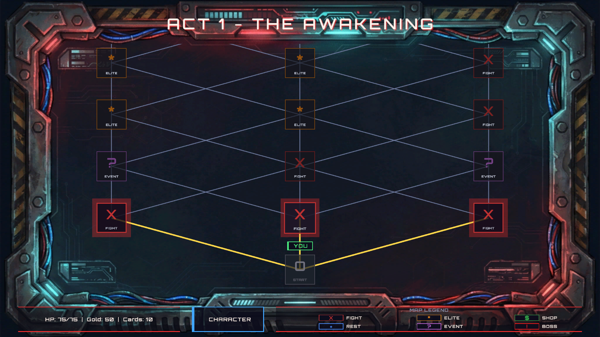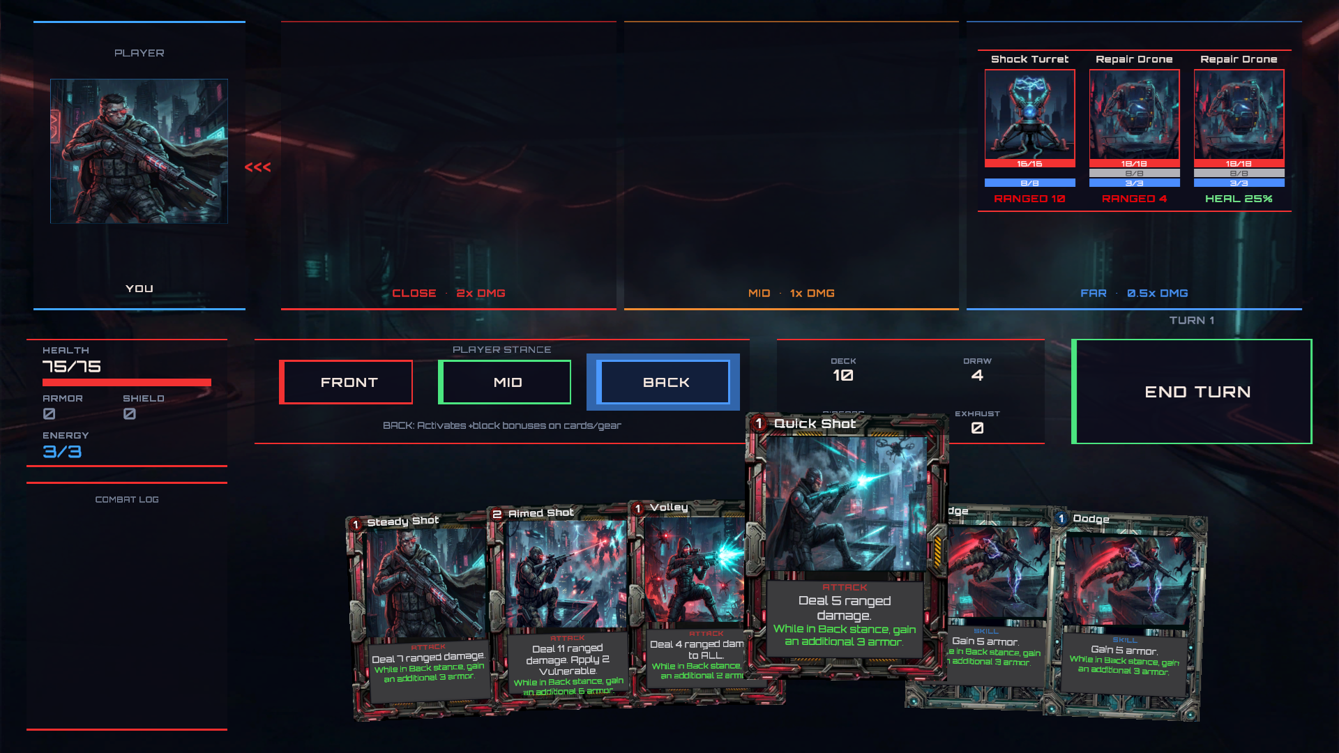 A cyberpunk roguelike deckbuilder. Wield a plasma sword, channel energy through an arc staff, or snipe from afar with a rail rifle. Build your deck, manage your shields, and outplay an adaptive AI through three procedurally-generated acts.